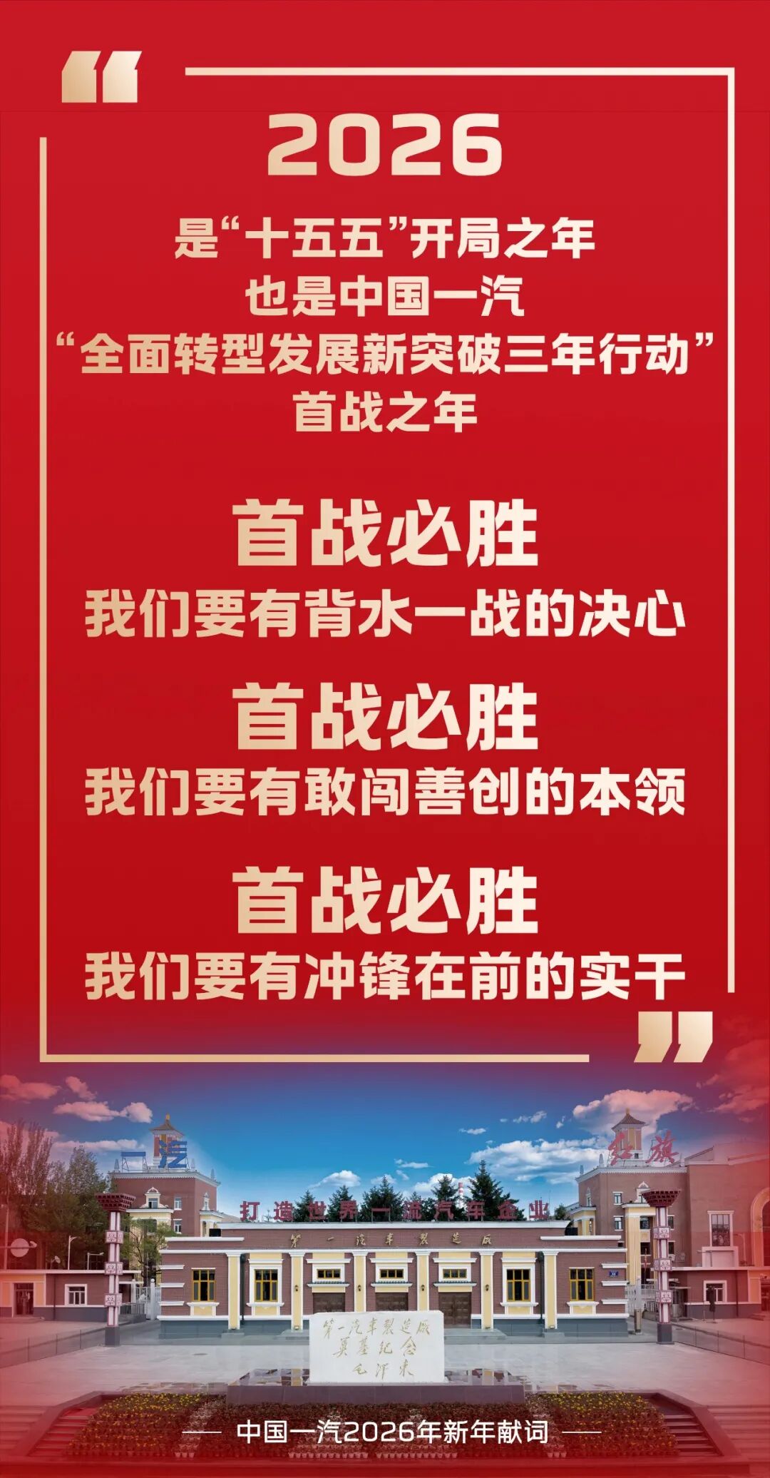 展望 2026 年,中国一汽表示,2026 是“十五五”开局之年,也是中国一汽“全面转型发展新突破三年行动”首战之年。IT之家注意到,中国一汽提到三个“首战必胜”。