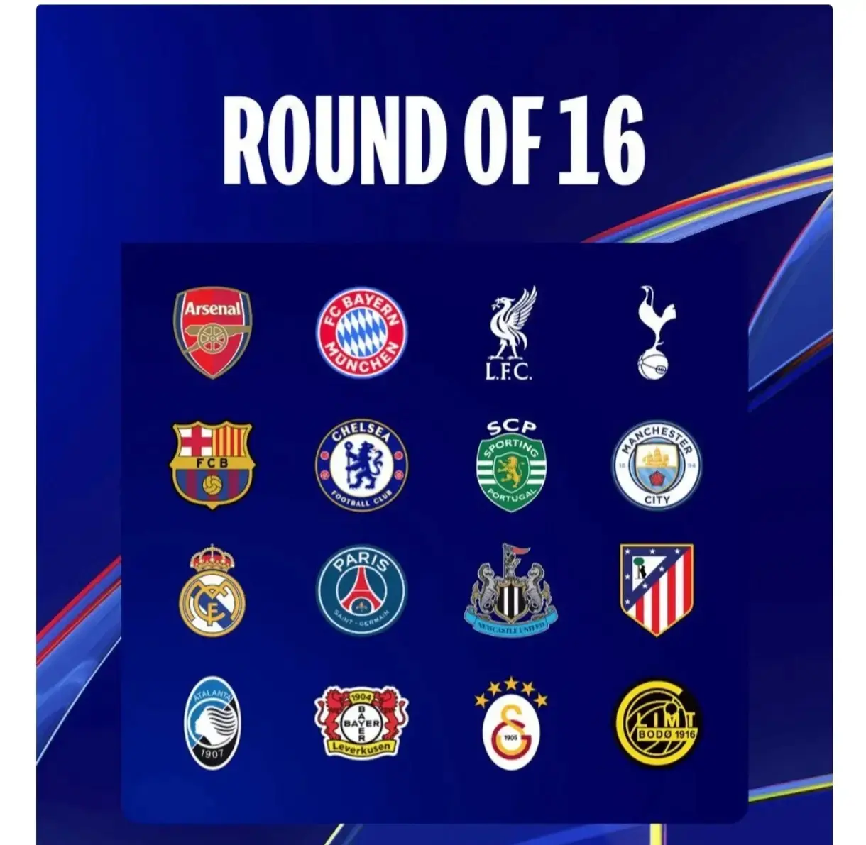 本赛季欧冠16强呈现出罕见的“一超多强”格局。以联赛阶段前八名身份直接晋级的球队包括:阿森纳、拜仁慕尼黑、利物浦、托特纳姆热刺、巴塞罗那、切尔西、葡萄牙体育、曼城。通过附加赛突围的八支球队则是:马德里竞技、勒沃库森、纽卡斯尔联、博德闪耀、皇家马德里、巴黎圣日耳曼、亚特兰大、加拉塔萨雷。