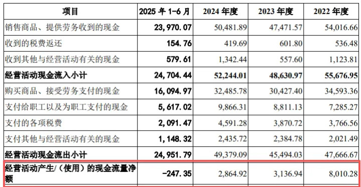然而,与持续增长的净利润形成鲜明对比的是,公司经营活动产生的现金流量净额呈现下滑趋势:从2022年的8010.28万元逐年下滑至2024年的2864.92万元,并在2025年上半年转为净流出247.35万元。