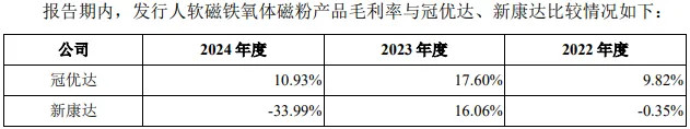 根据招股书,2022年至2024年,春光集团的软磁铁氧体磁粉毛利率分别为16.69%、21.63%、21.07%,软磁铁氧体磁心产品毛利率分别为23.97%、25.01%、25.15%,电子元器件毛利率分别为12.67%、10.23%、13.76%,电源产品毛利率分别为-48.11%、-22.42%、-7.75%。其中,软磁铁氧体磁粉毛利率显著高于可比公司冠优达与新康达。